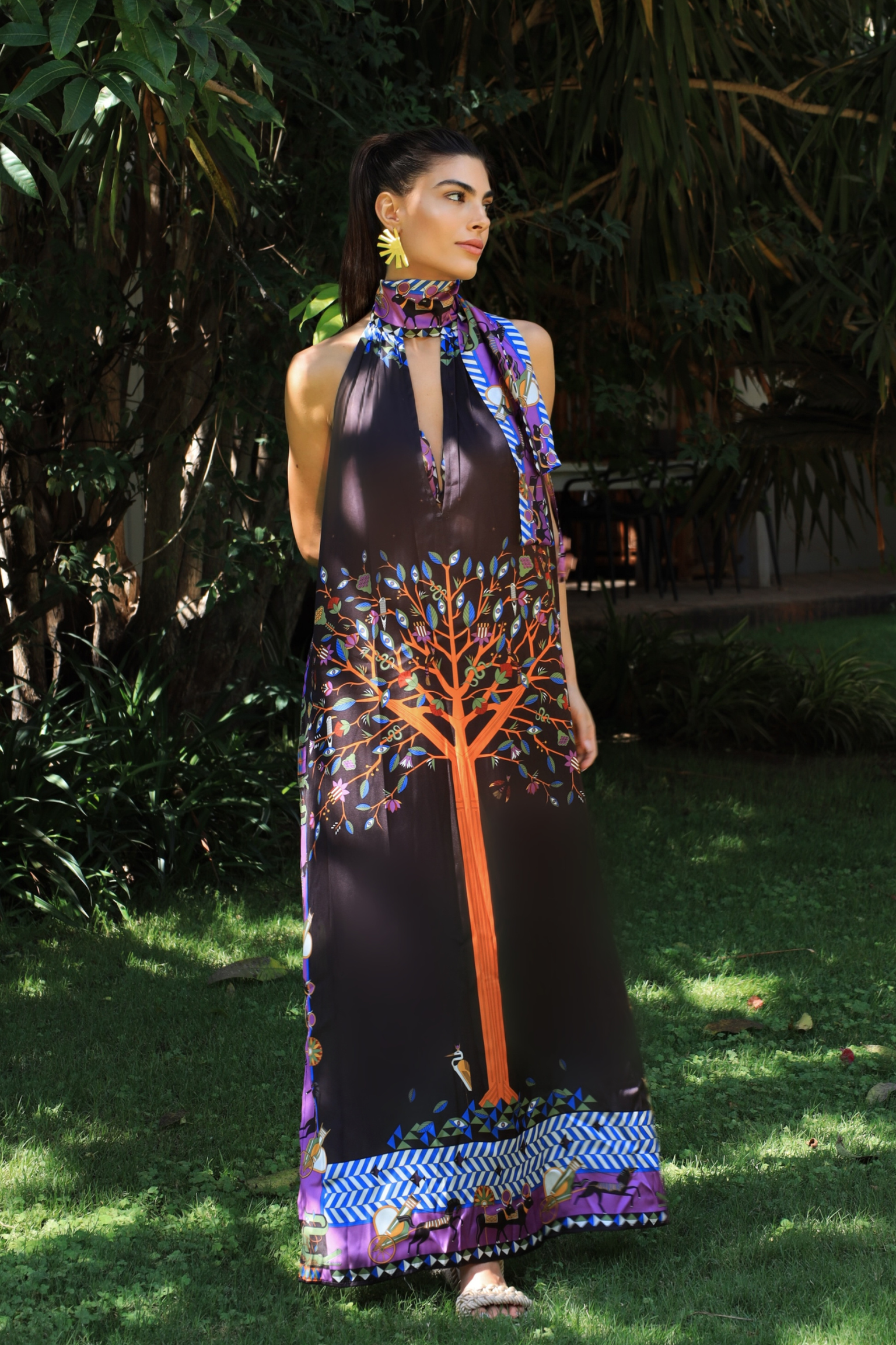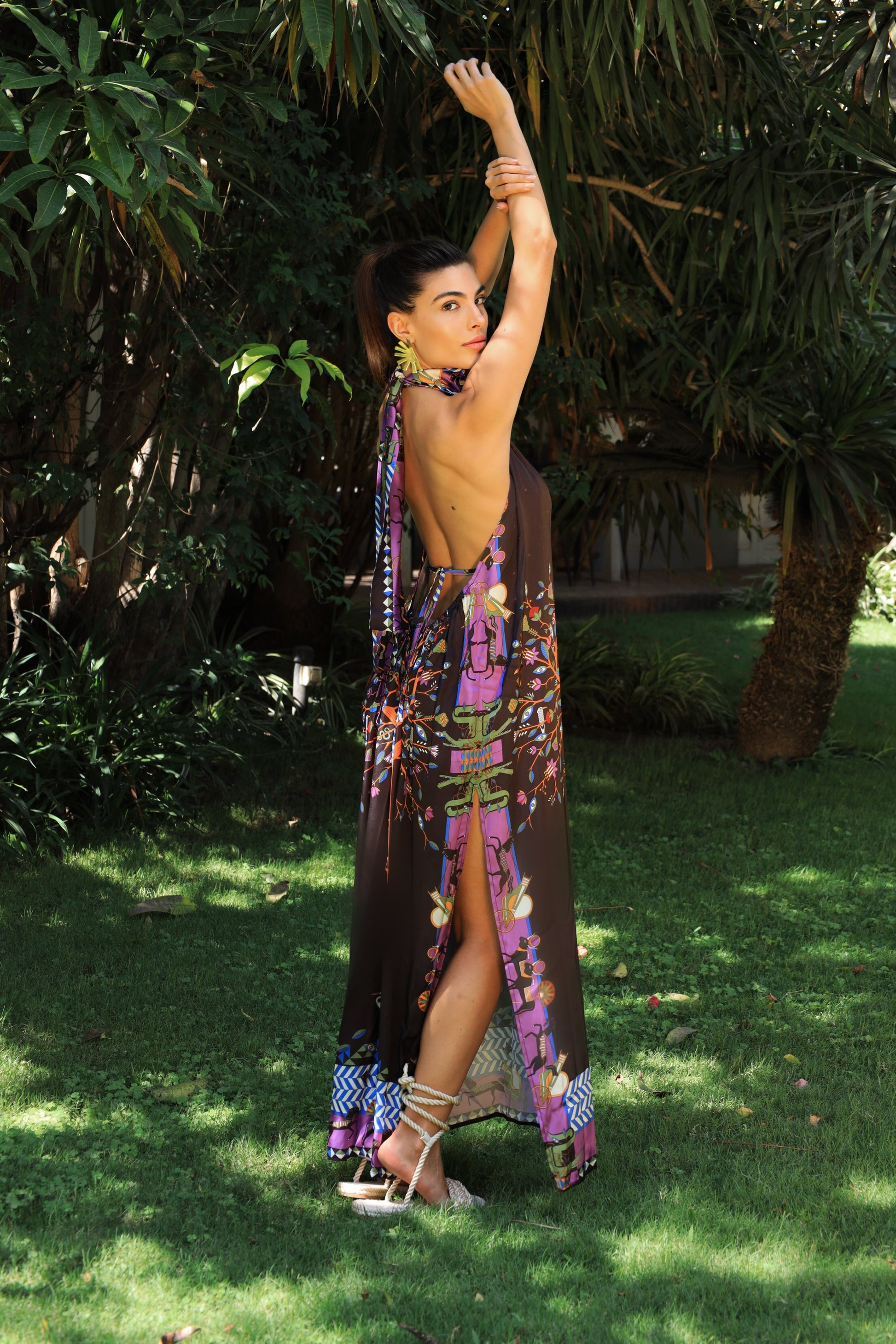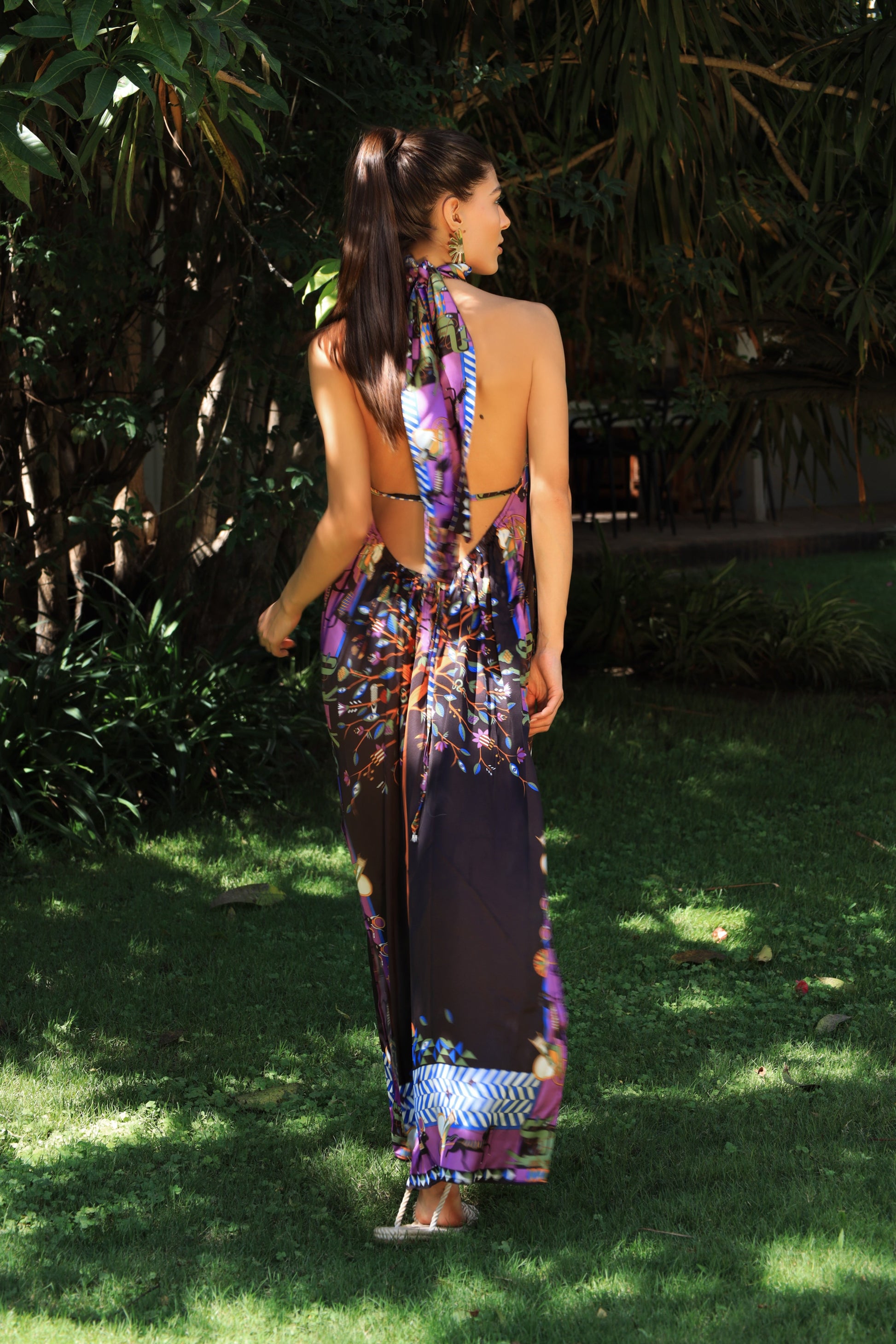 Make a statement this summer in this backless dress with V neckline. it’s cut from silk satin material and has slings on the sides and adjustable waist ties to ensure the perfect fit.