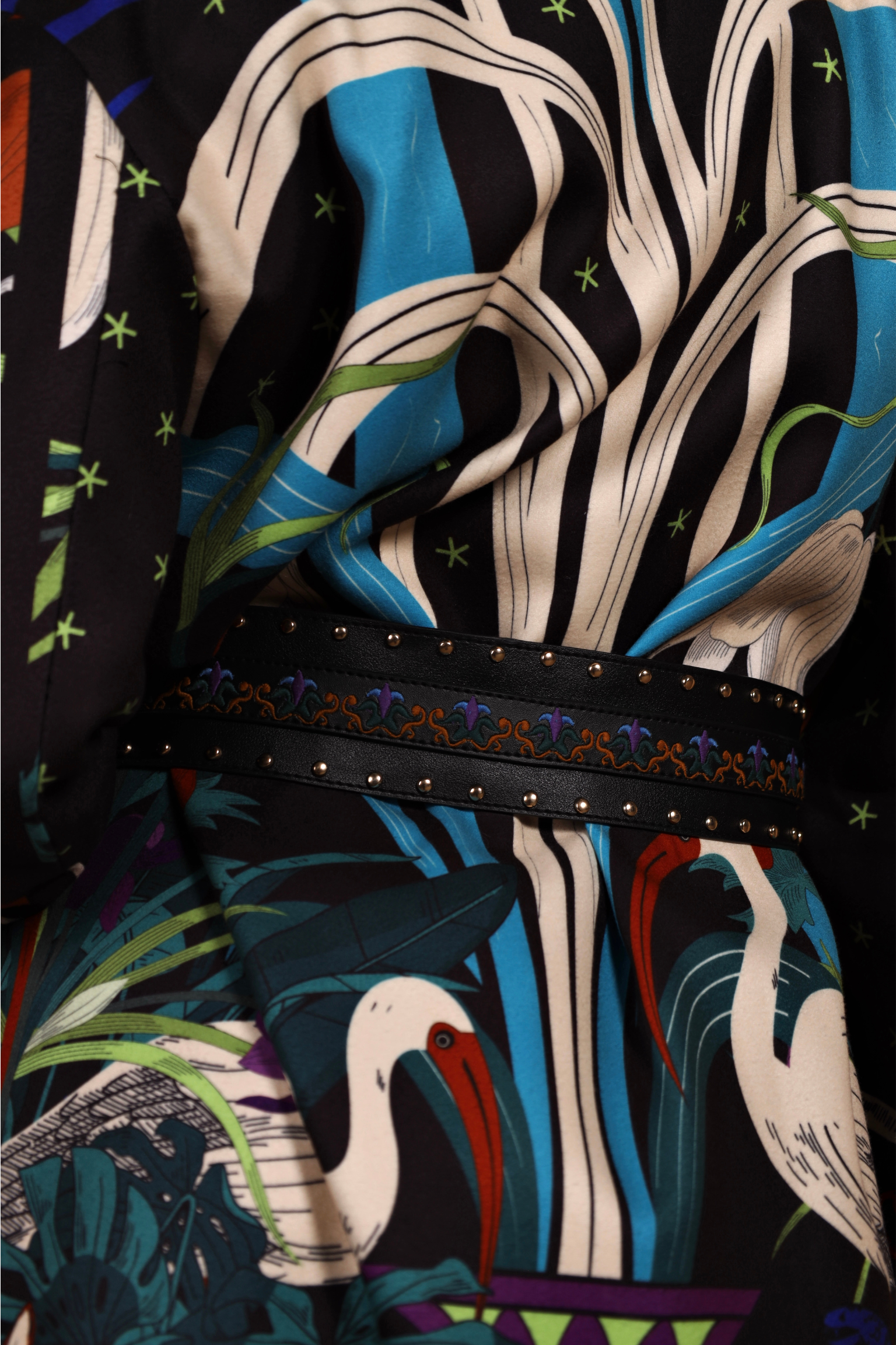 The illustrations feature herons, lotus blooms, papyrus reeds, and cascading water lines, reflecting ancient Egyptian waterways and gardens. It comes with an embroidered leather belt, adorned with motifs inspired by Nile flora — adding refinement and definition to the silhouette.