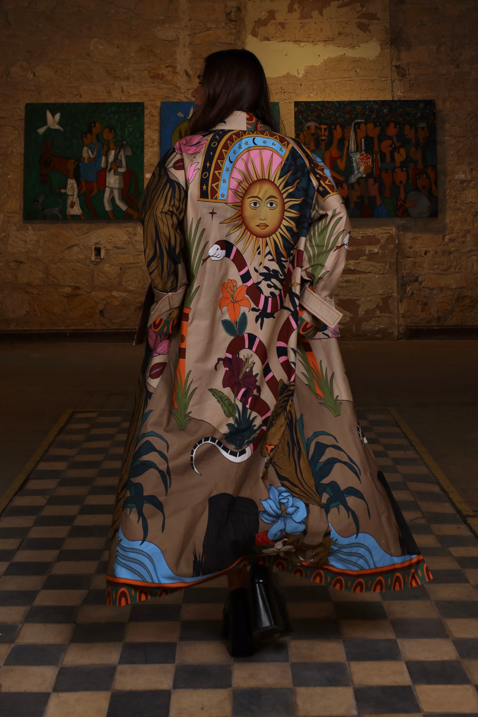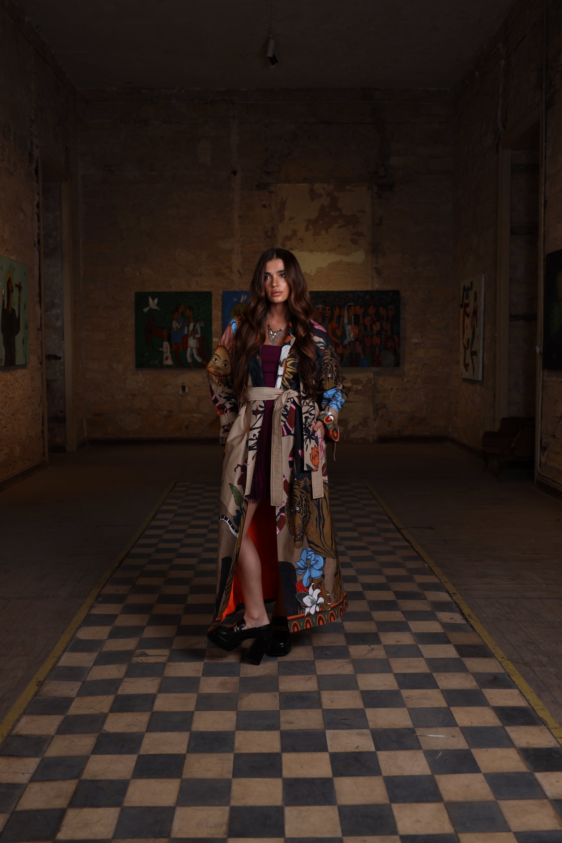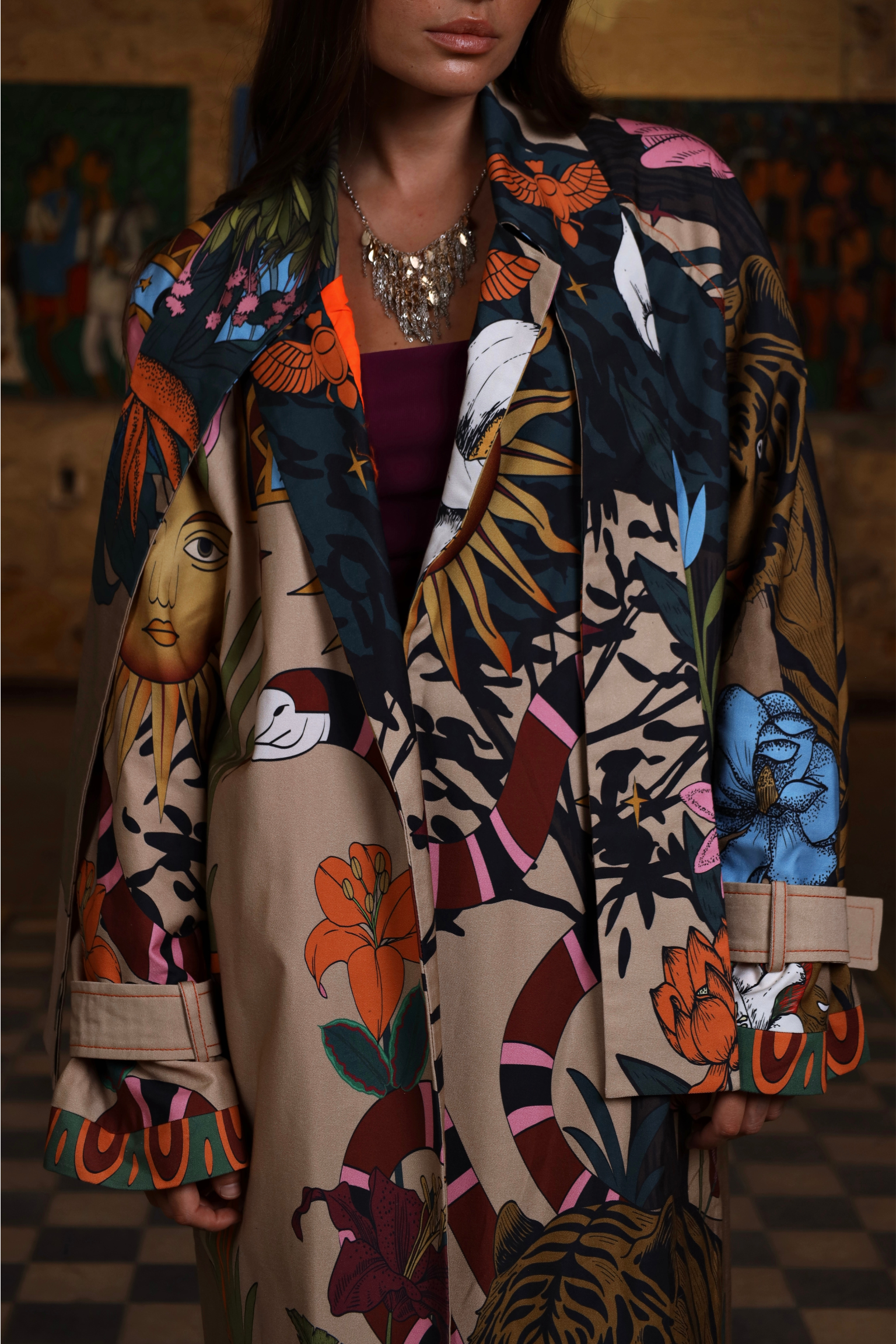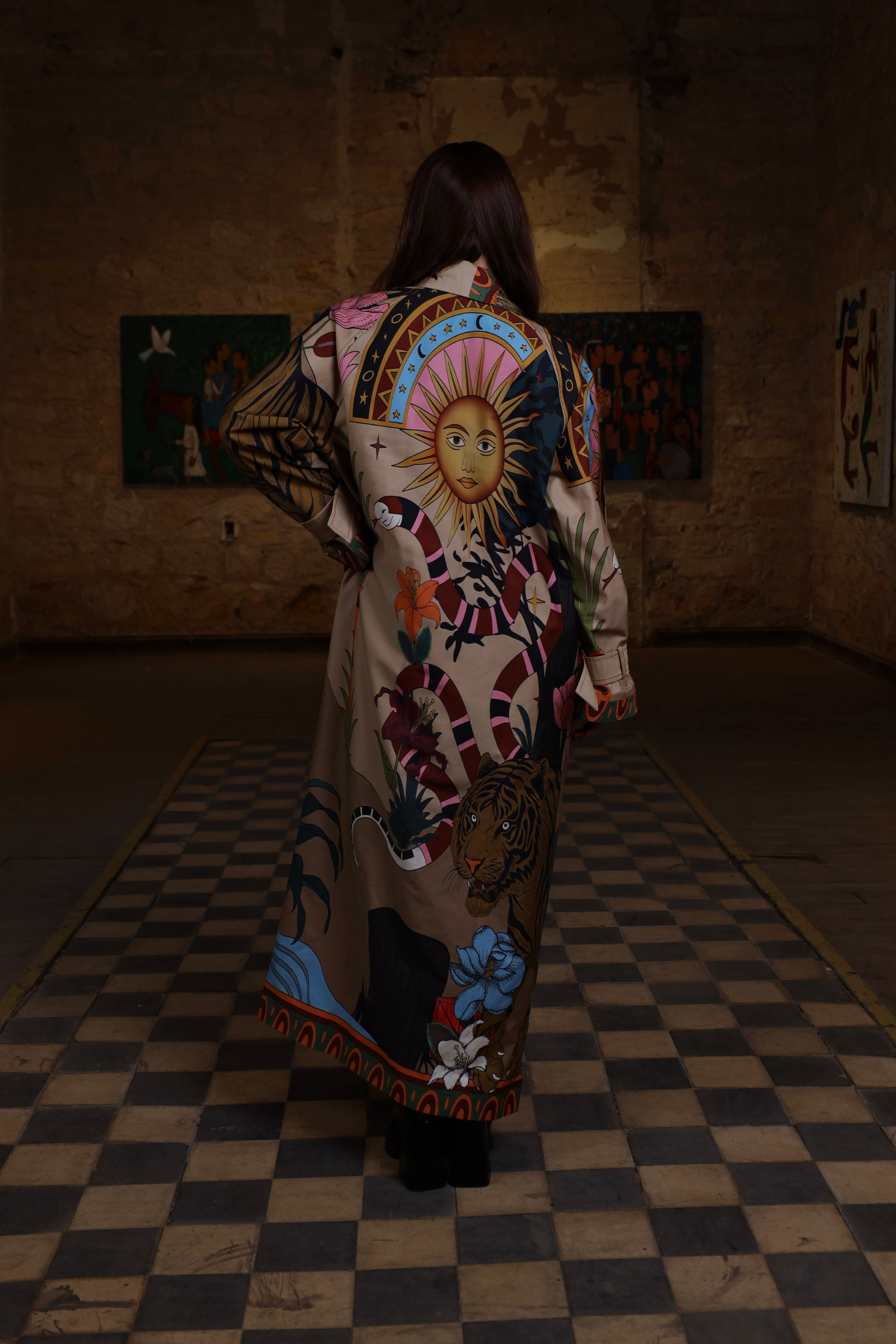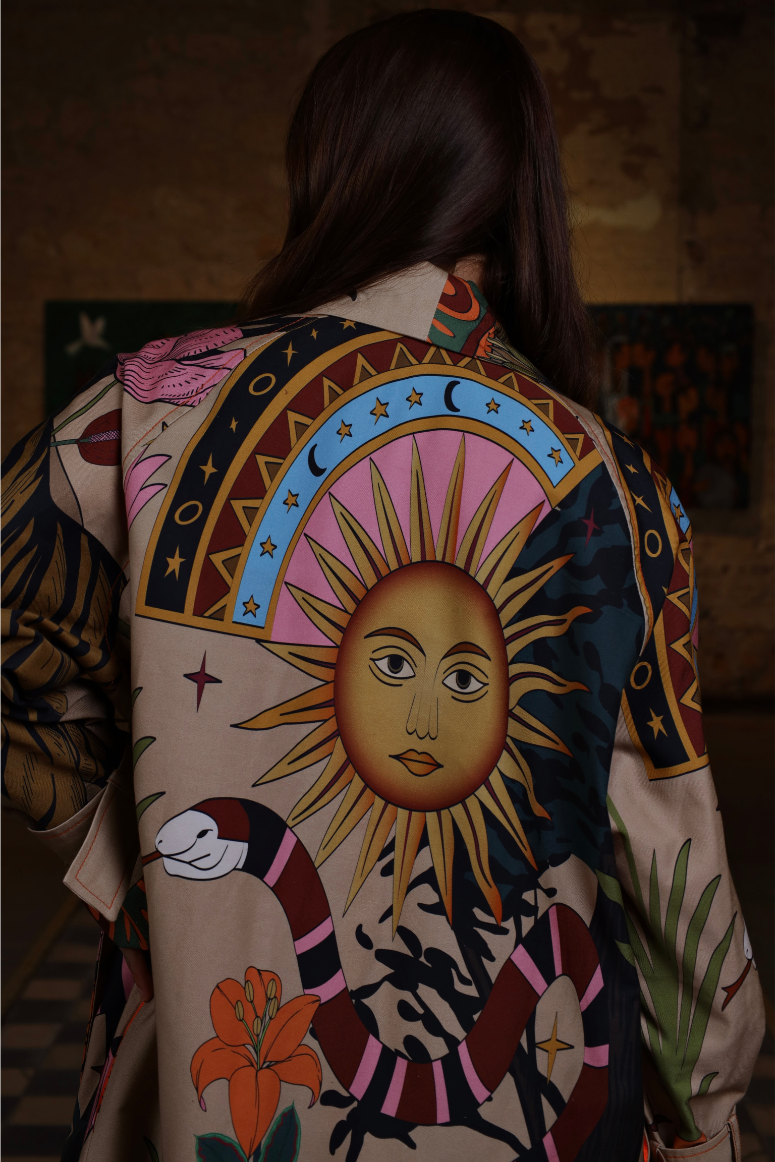 A masterpiece crafted from 100% natural gabardine, this trench coat channels the deep, stabilizing energy of Earth through rich symbolic artwork and refined tailoring. The silhouette is elegant and fluid, featuring classic lapels, adjustable cuffs, and a draped structure that moves with grace. A statement piece that blends ancient heritage with modern luxury — perfect for collectors, art lovers, and those connected to Earth’s grounding energy.