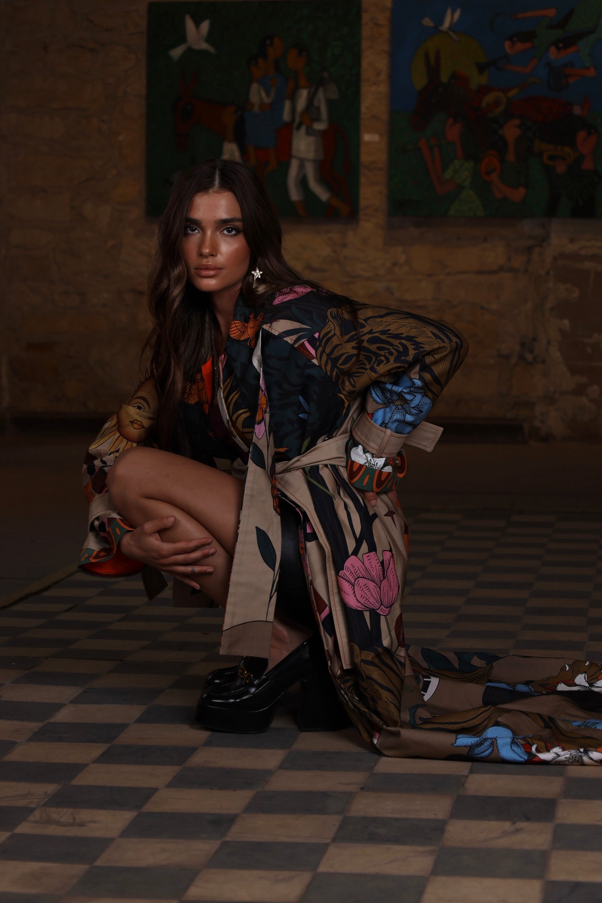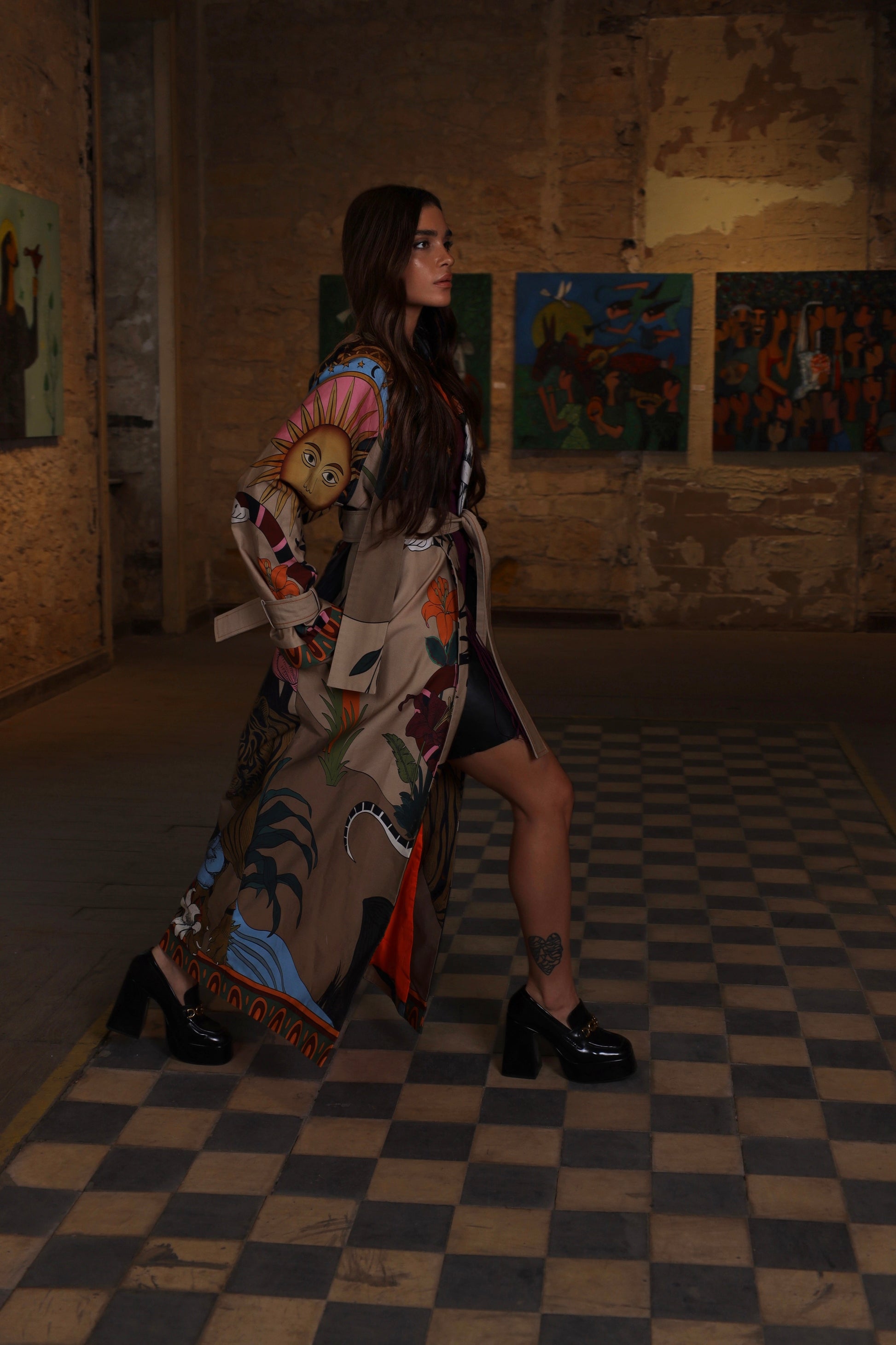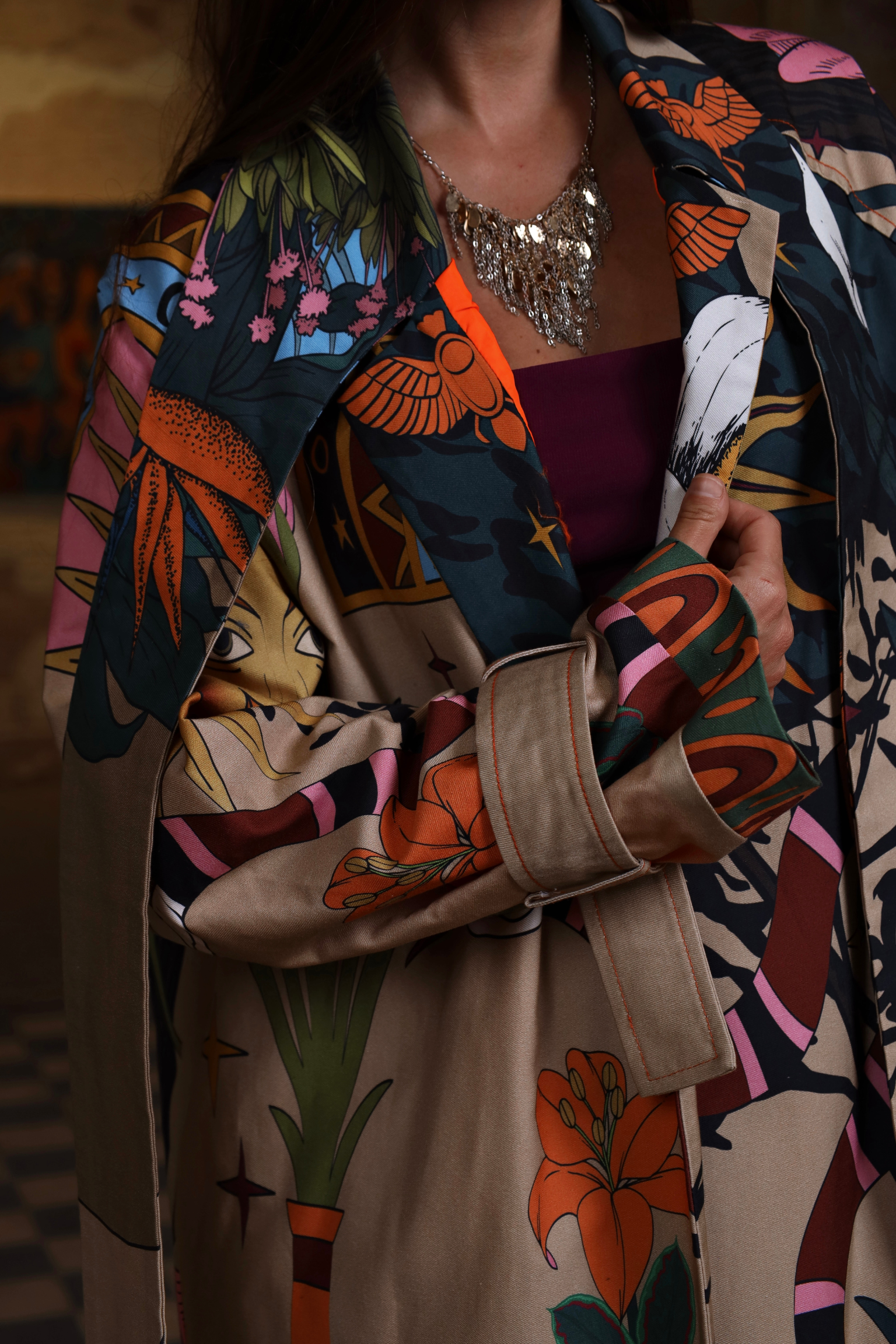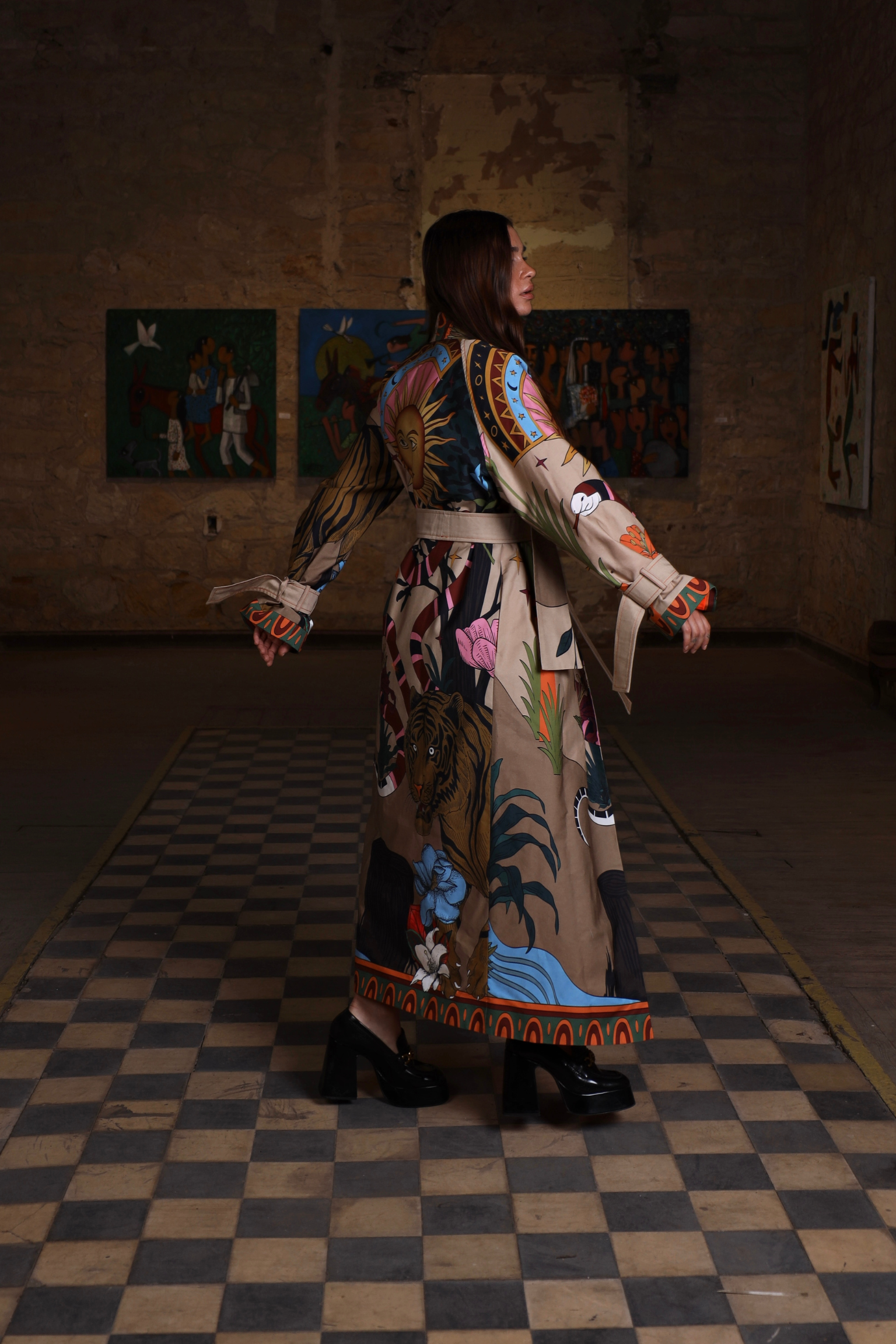 A masterpiece crafted from 100% natural gabardine, this trench coat channels the deep, stabilizing energy of Earth through rich symbolic artwork and refined tailoring. The silhouette is elegant and fluid, featuring classic lapels, adjustable cuffs, and a draped structure that moves with grace. A statement piece that blends ancient heritage with modern luxury — perfect for collectors, art lovers, and those connected to Earth’s grounding energy.