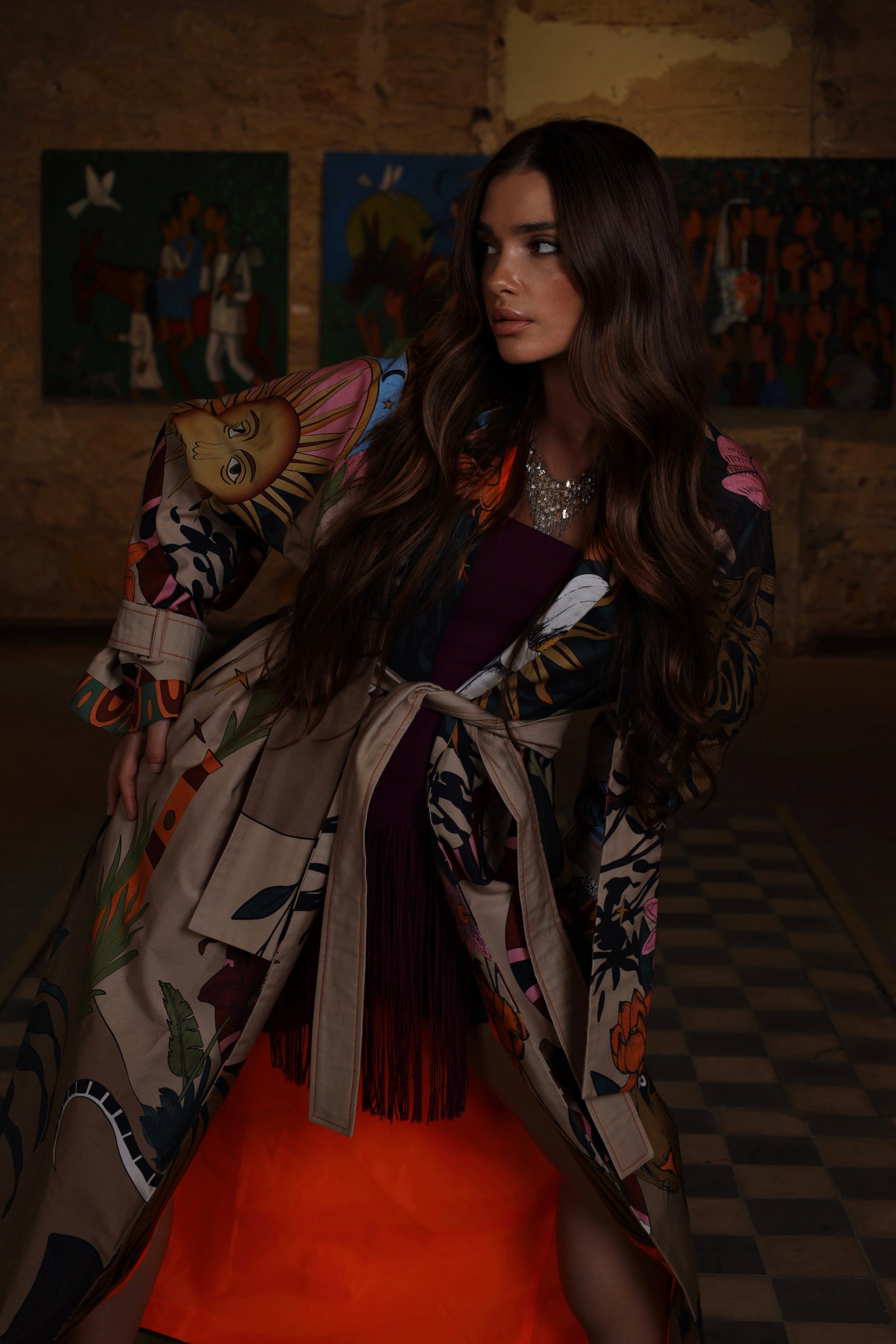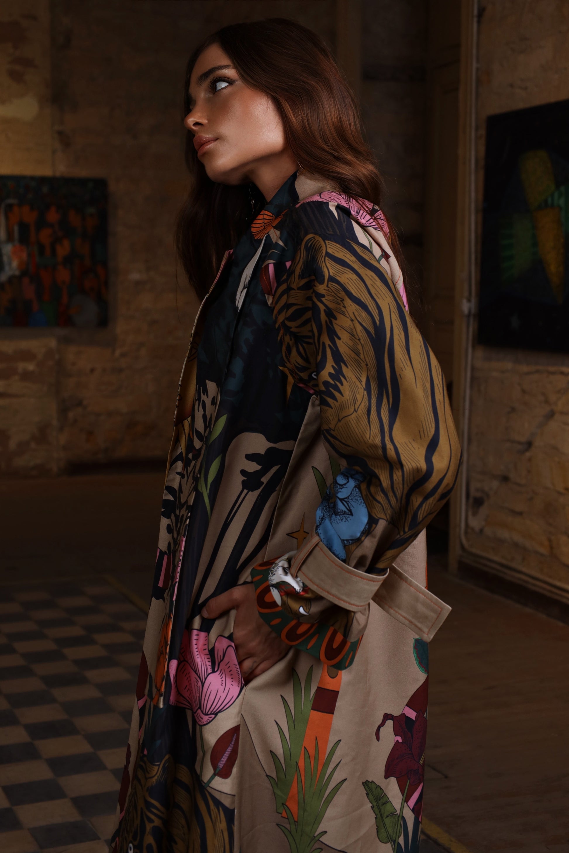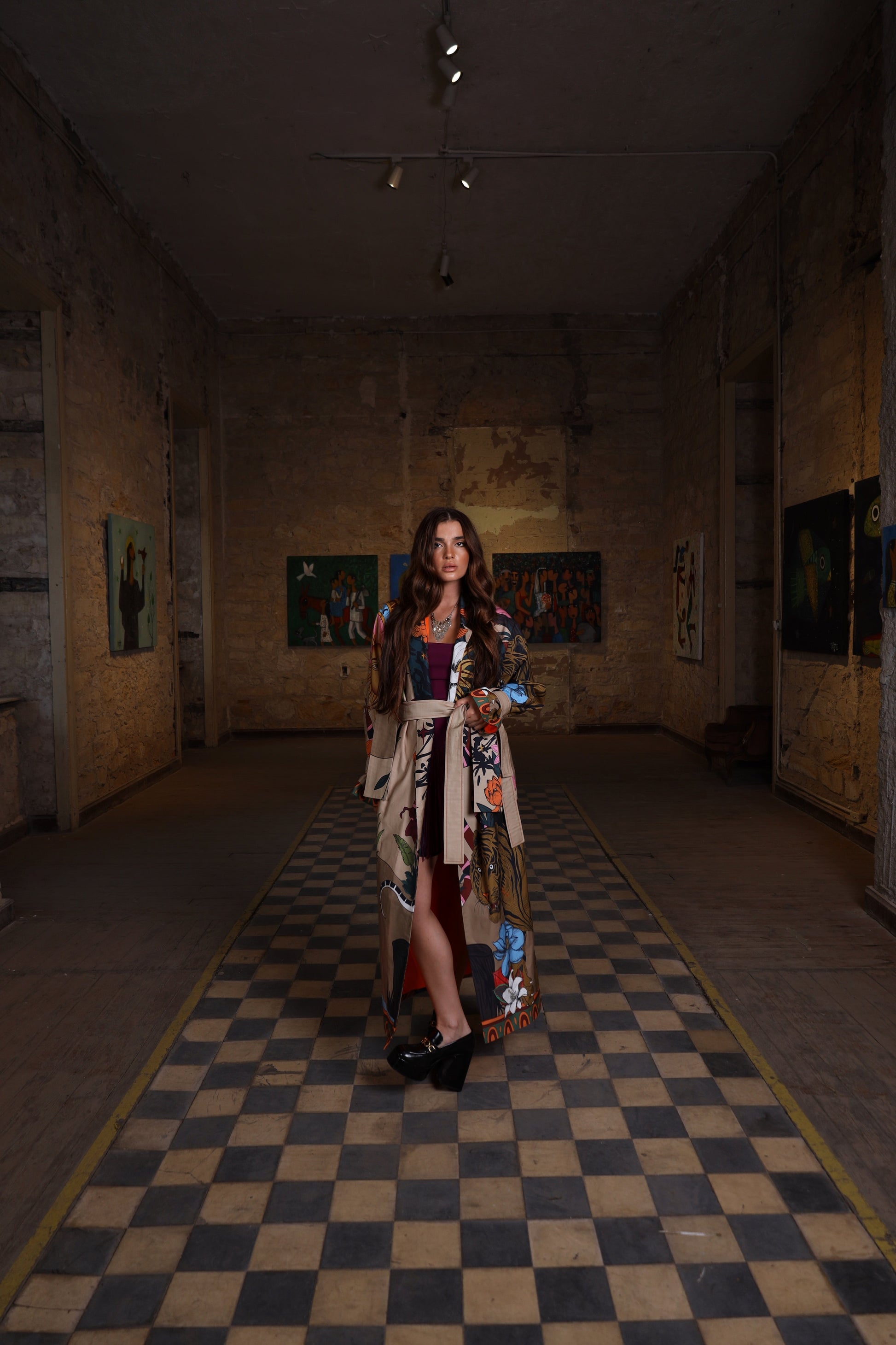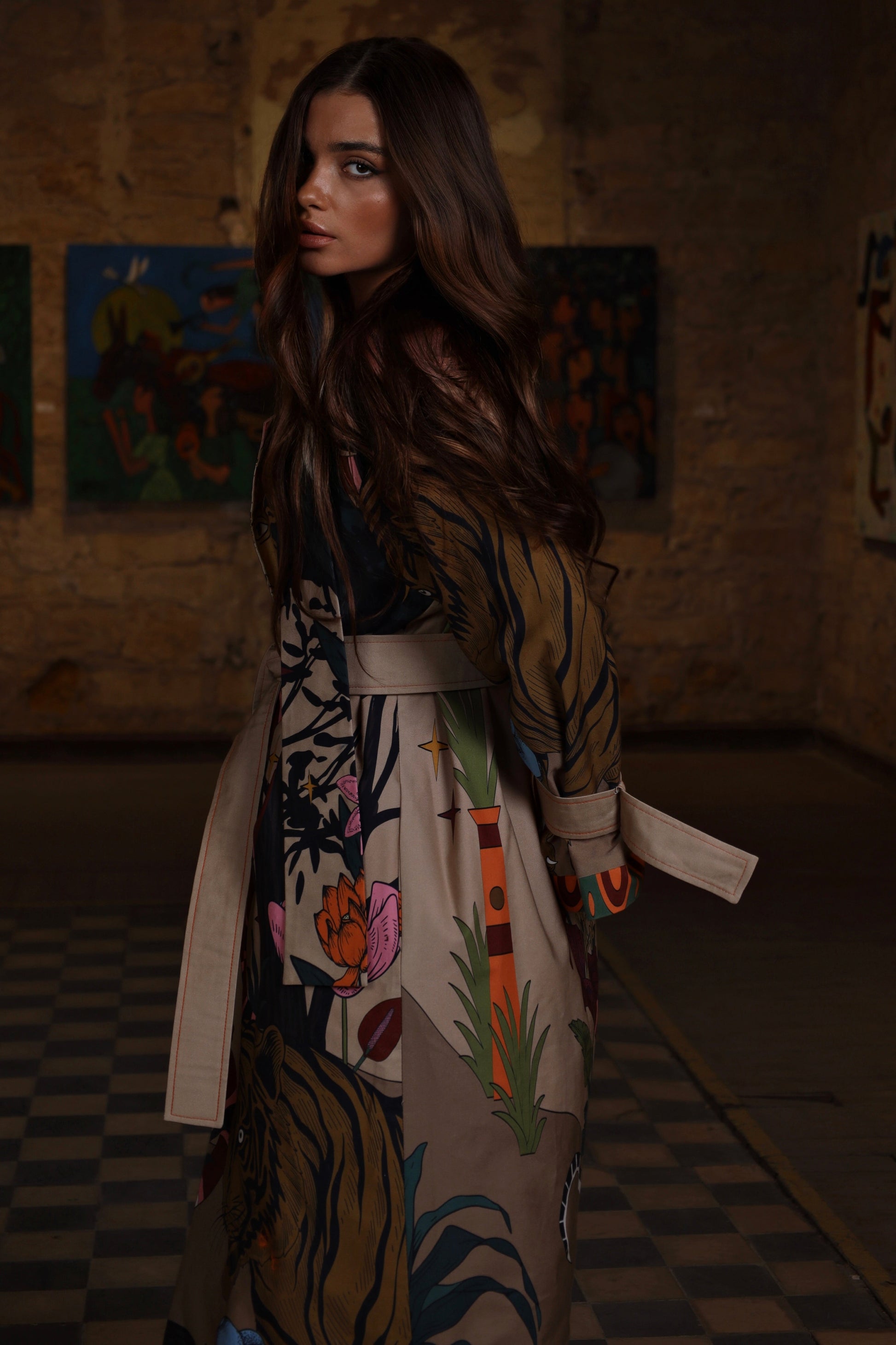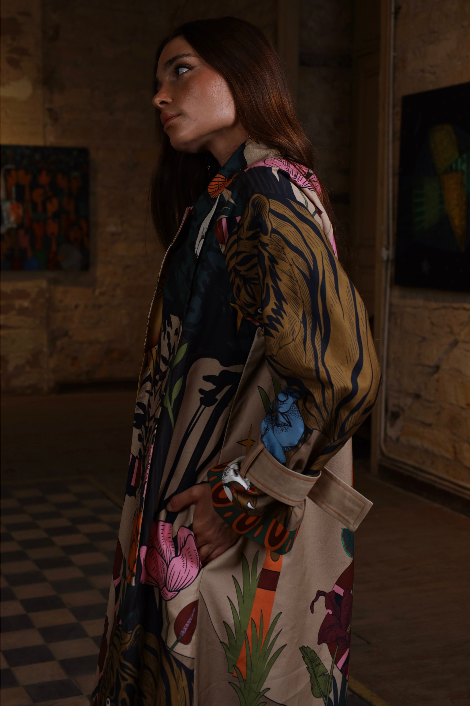 A masterpiece crafted from 100% natural gabardine, this trench coat channels the deep, stabilizing energy of Earth through rich symbolic artwork and refined tailoring. The silhouette is elegant and fluid, featuring classic lapels, adjustable cuffs, and a draped structure that moves with grace. A statement piece that blends ancient heritage with modern luxury — perfect for collectors, art lovers, and those connected to Earth’s grounding energy.