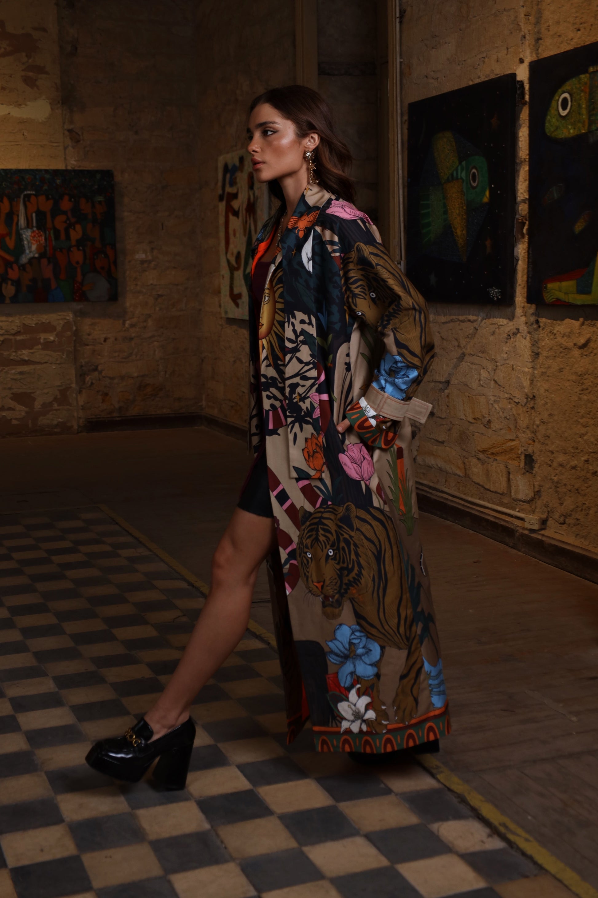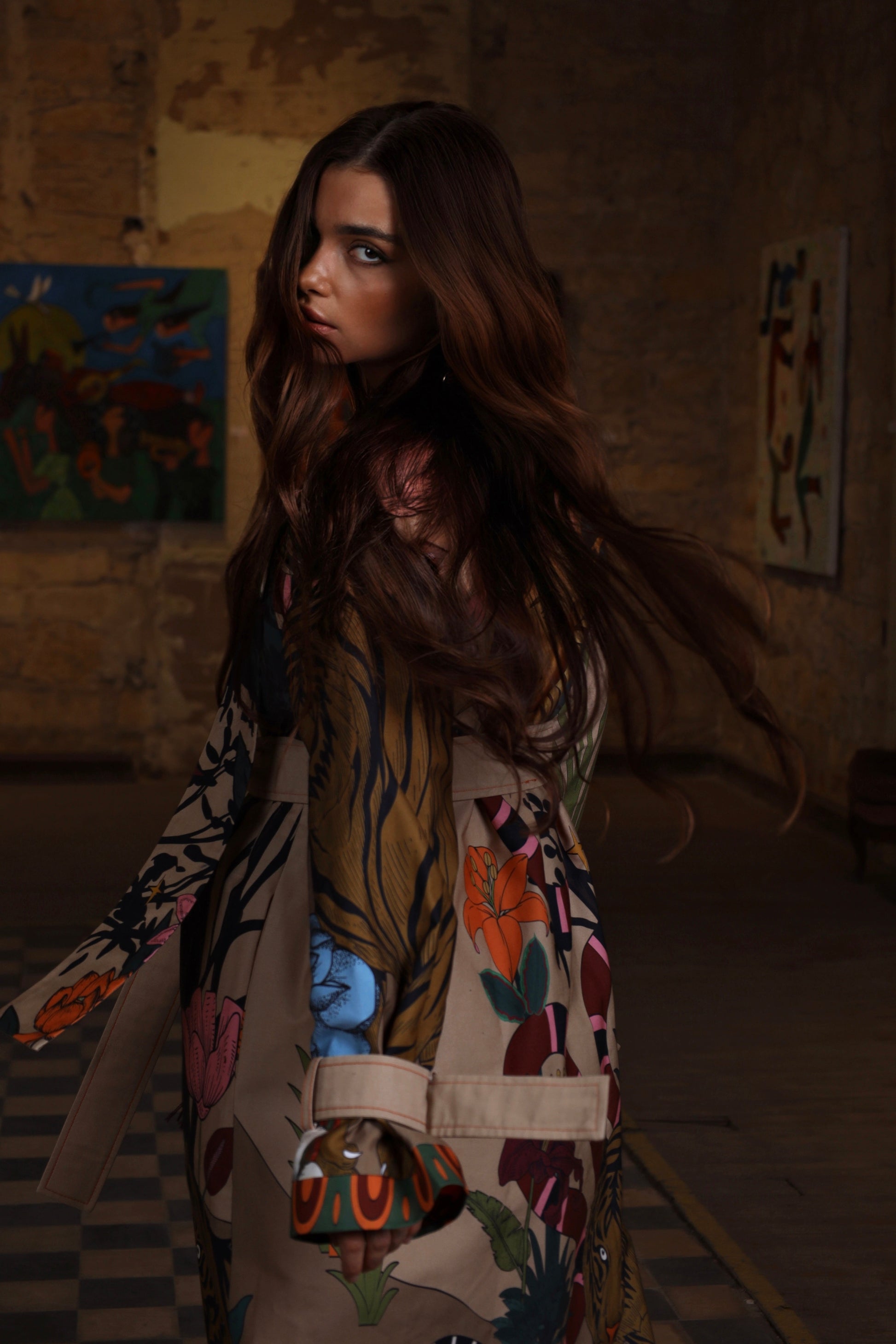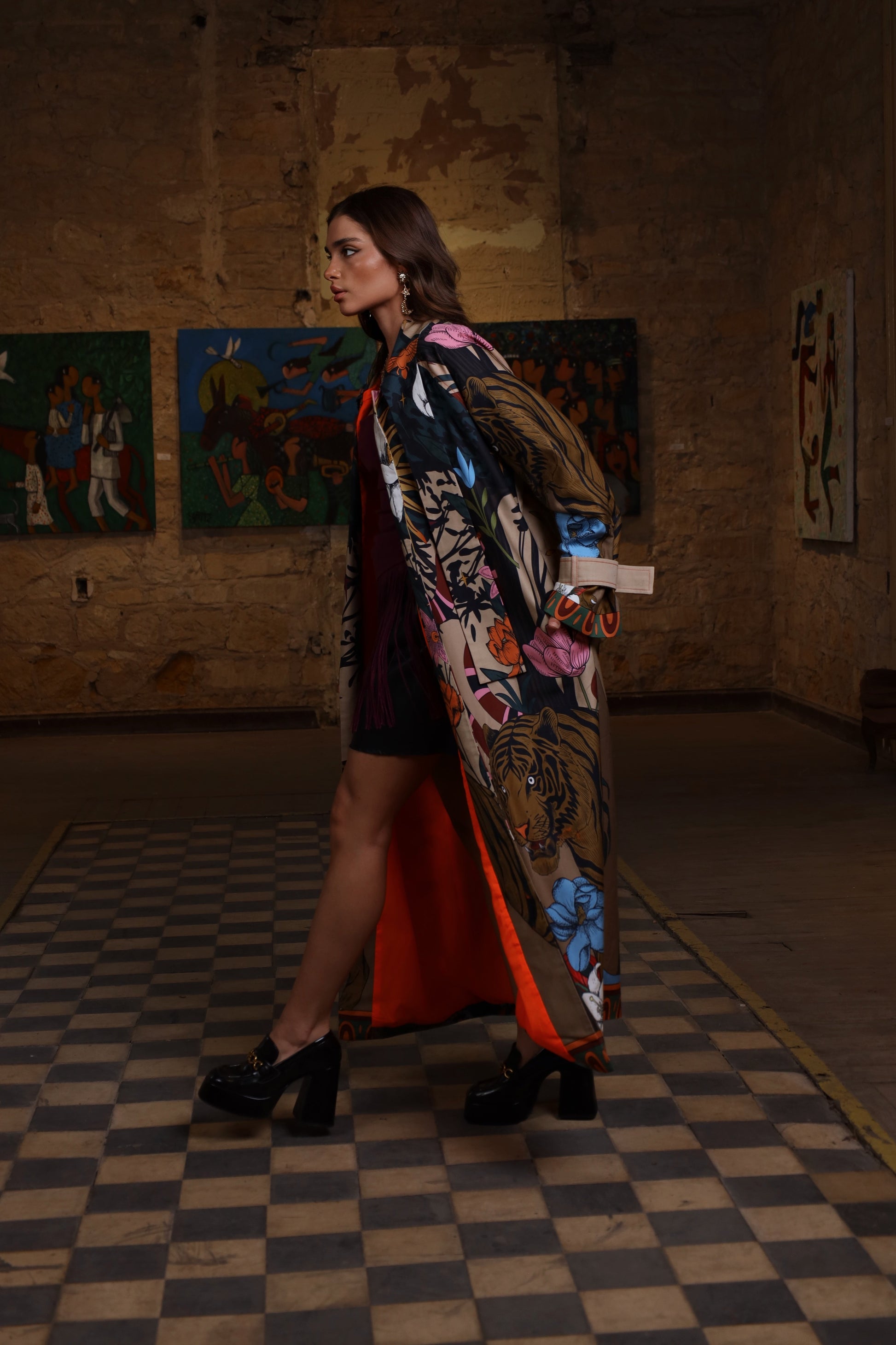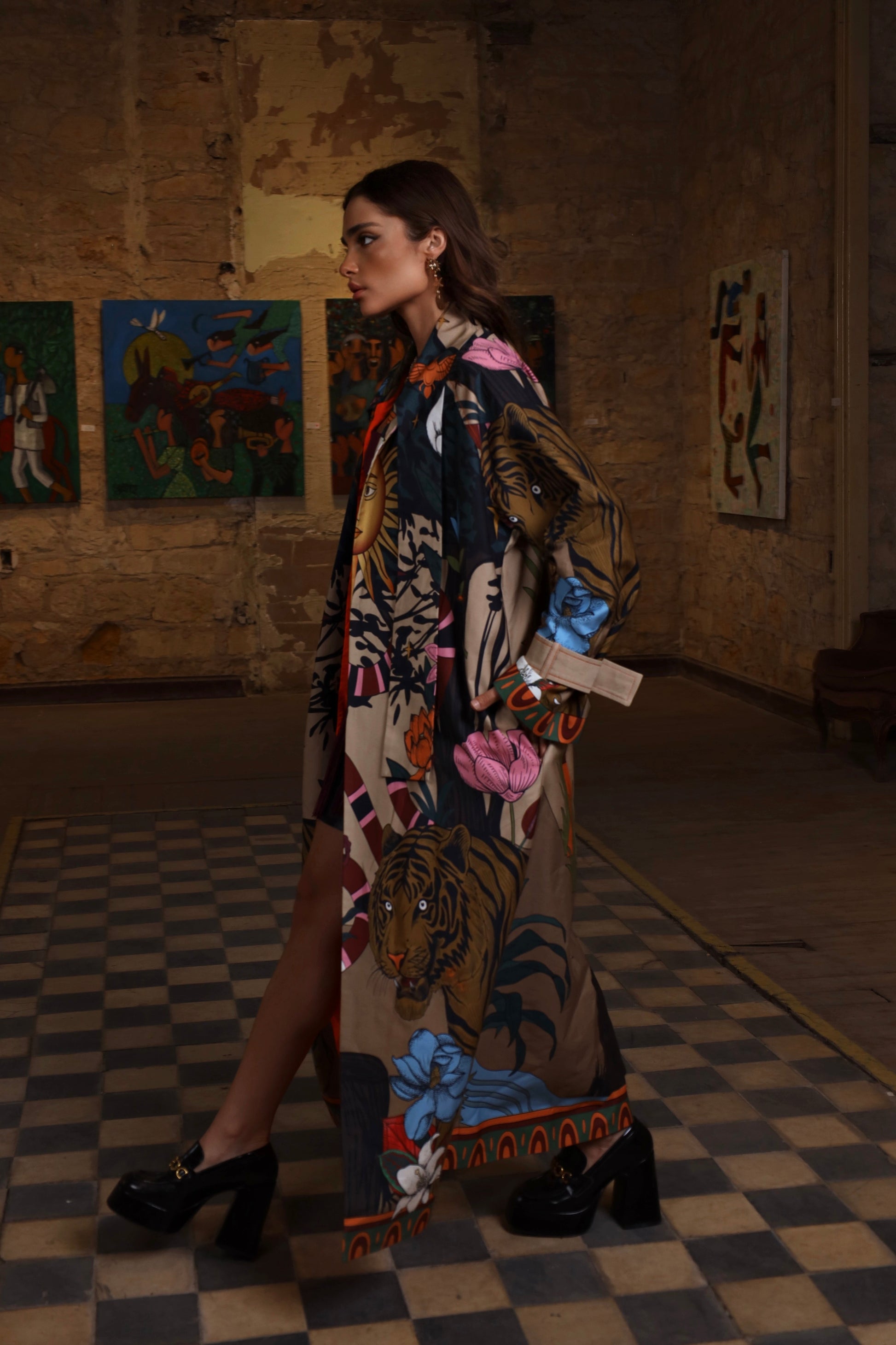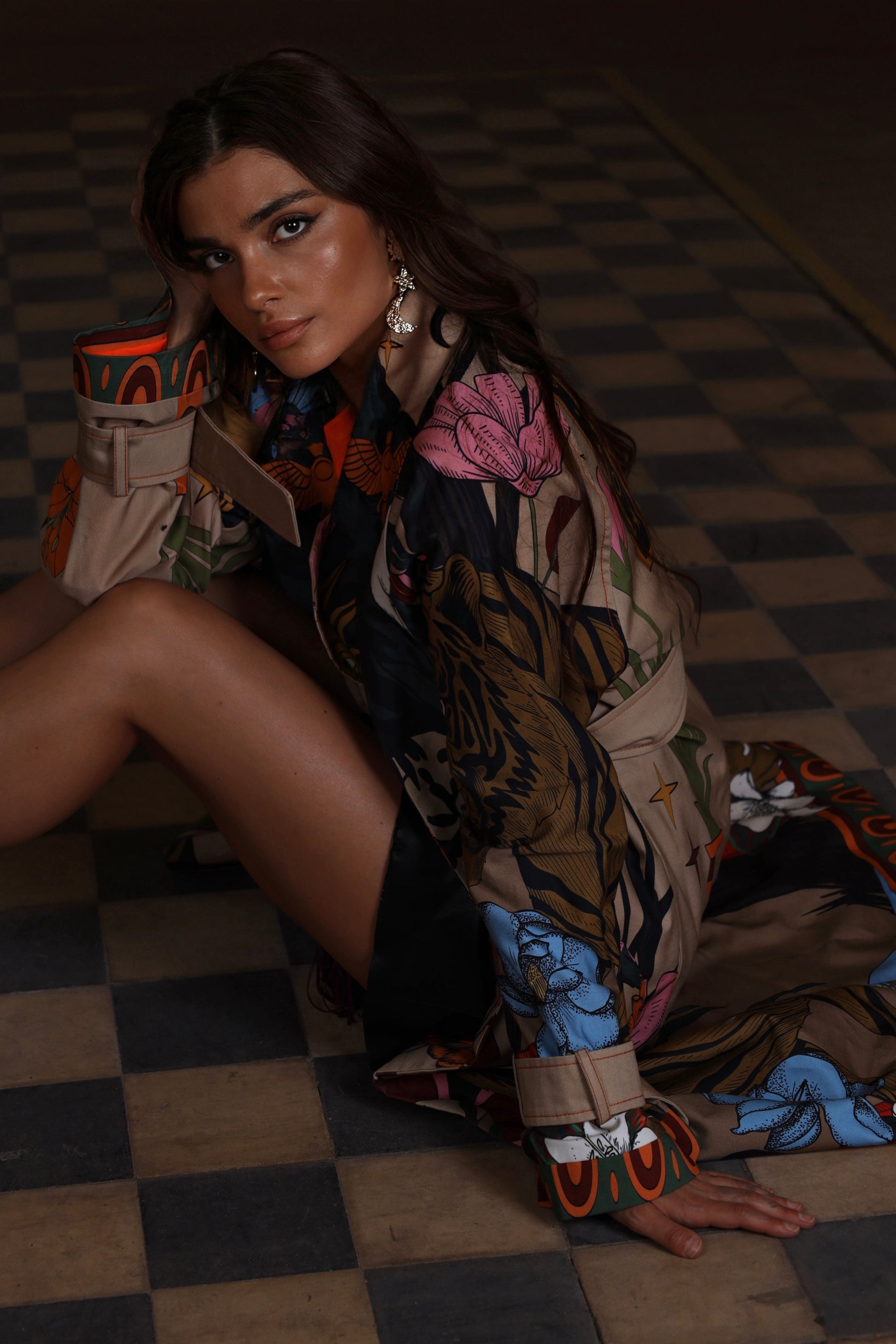 A masterpiece crafted from 100% natural gabardine, this trench coat channels the deep, stabilizing energy of Earth through rich symbolic artwork and refined tailoring. The silhouette is elegant and fluid, featuring classic lapels, adjustable cuffs, and a draped structure that moves with grace. A statement piece that blends ancient heritage with modern luxury — perfect for collectors, art lovers, and those connected to Earth’s grounding energy.