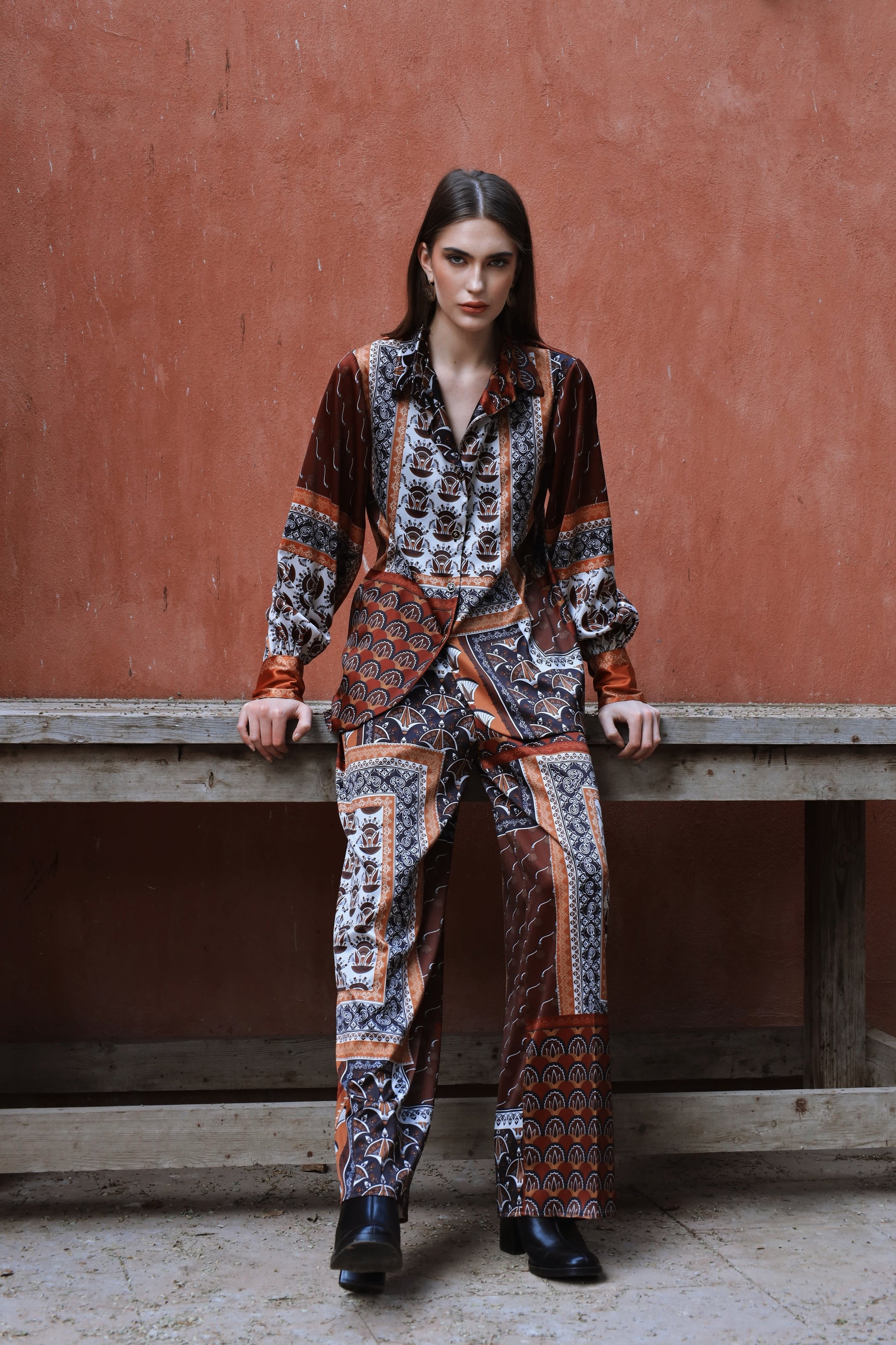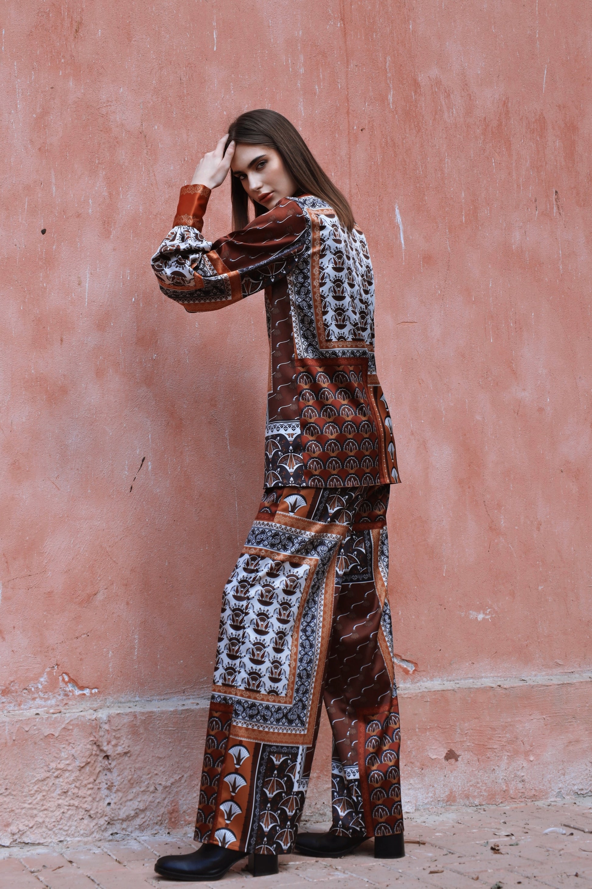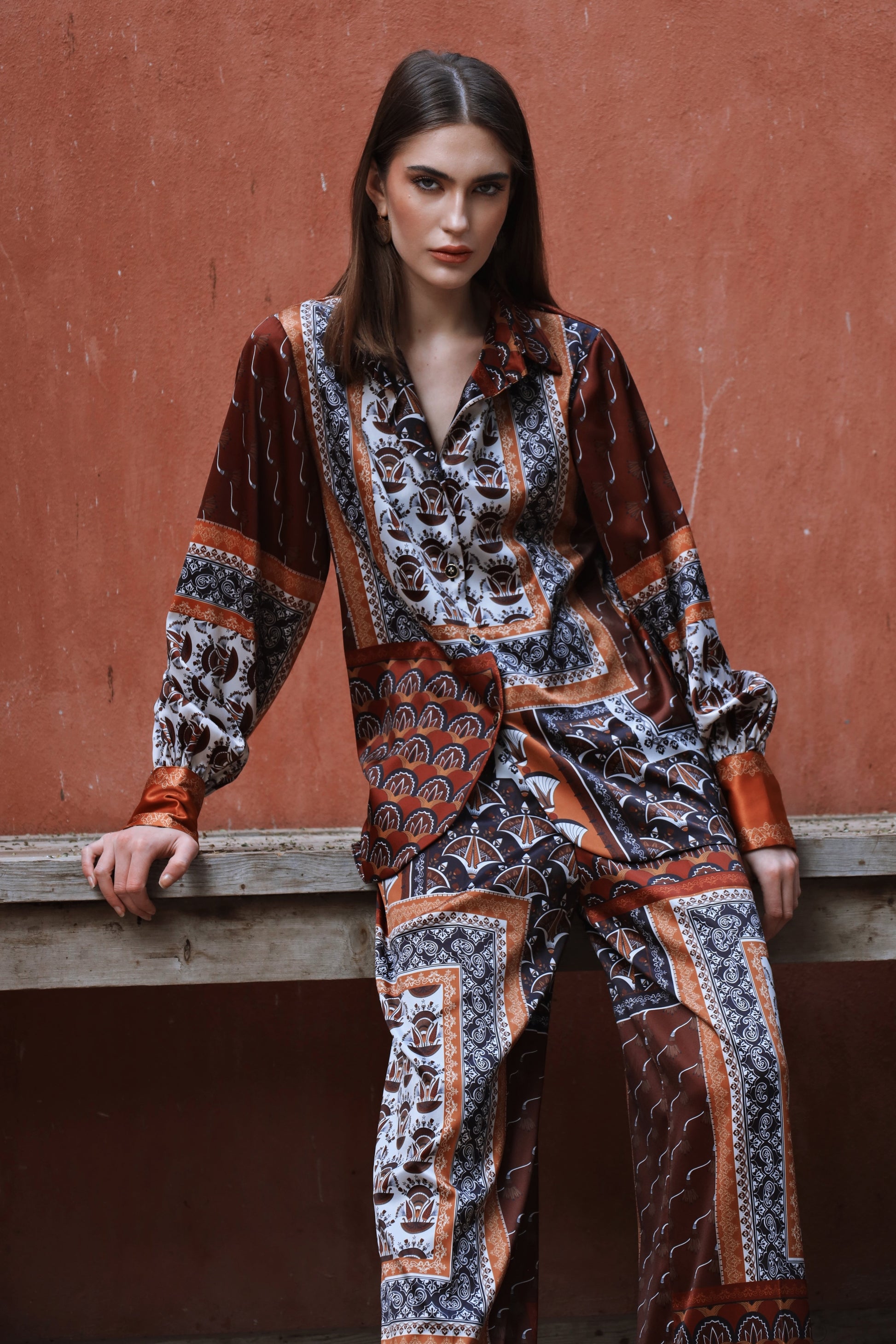 An elegant Victorian-inspired Papyrus Whisper set crafted in luxurious Korean satin. The set features a delicate chemise with a high neckline, buttons, paired with flowing pants that echo timeless grace. Intricate stitching and a soft sheen evoke the beauty of papyrus reeds, blending sophistication and comfort."
