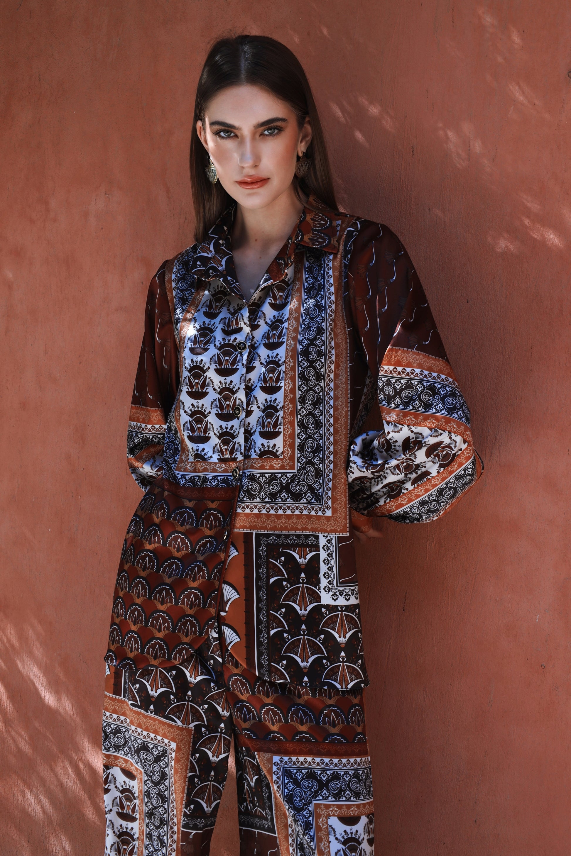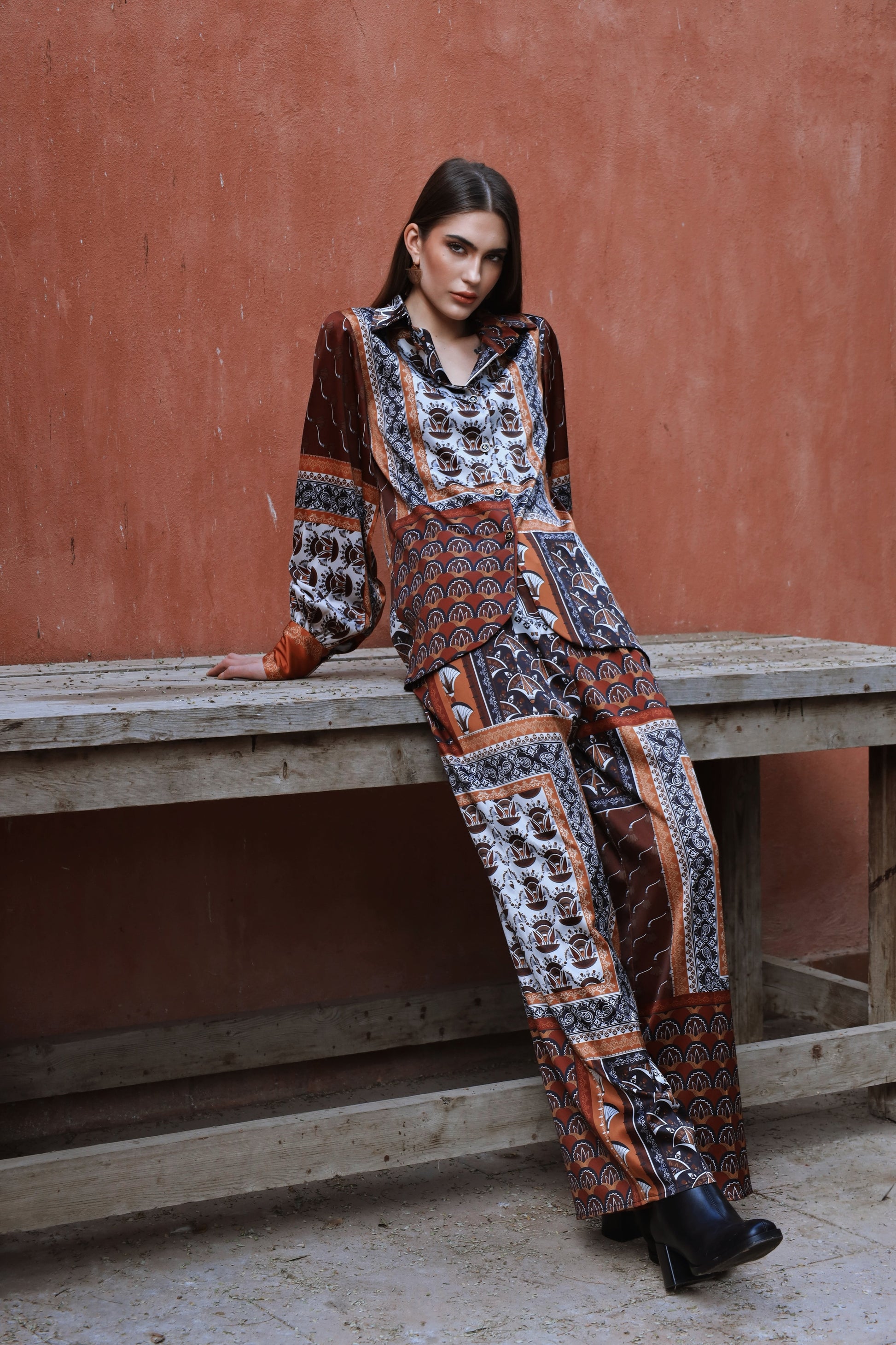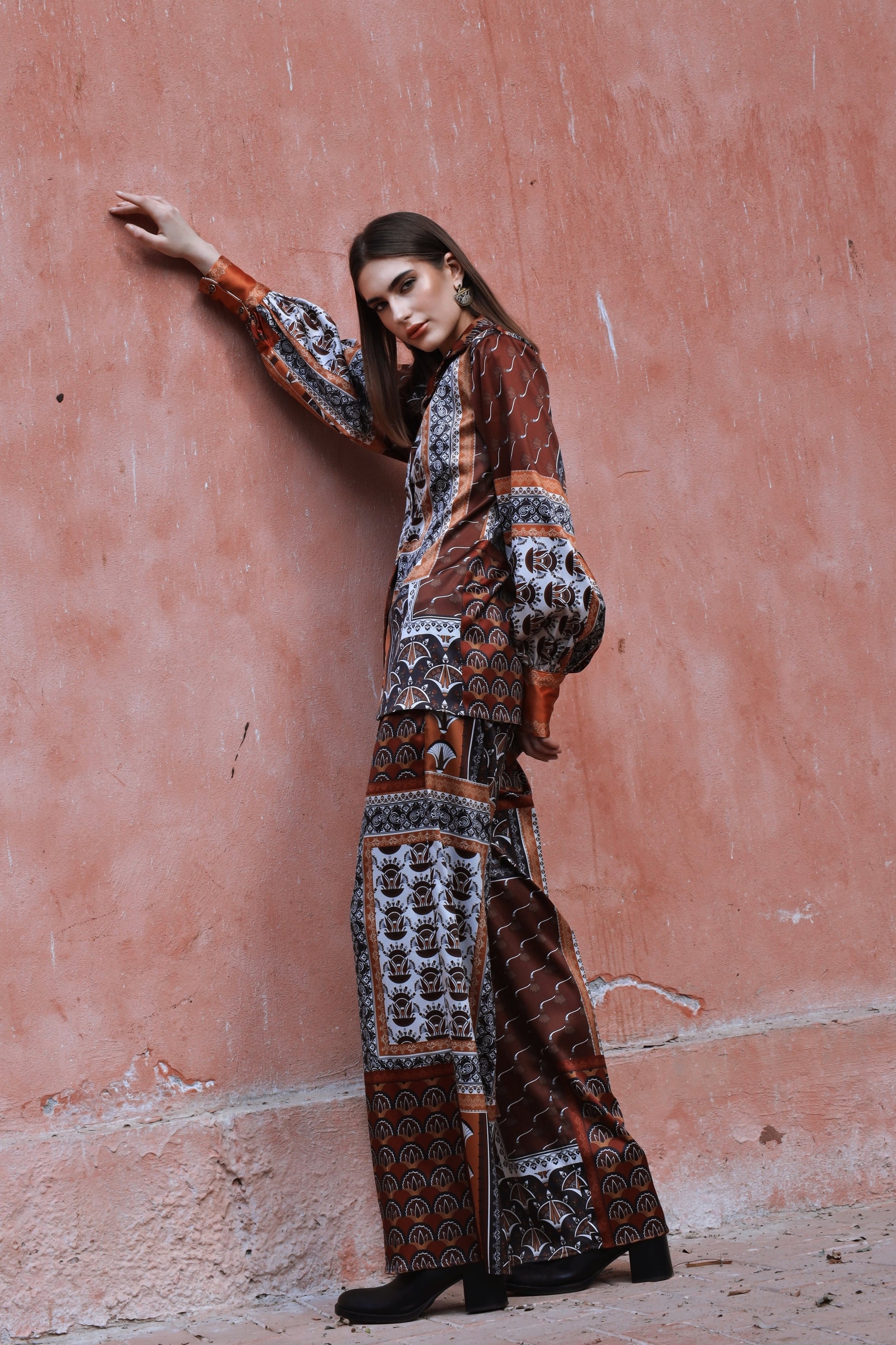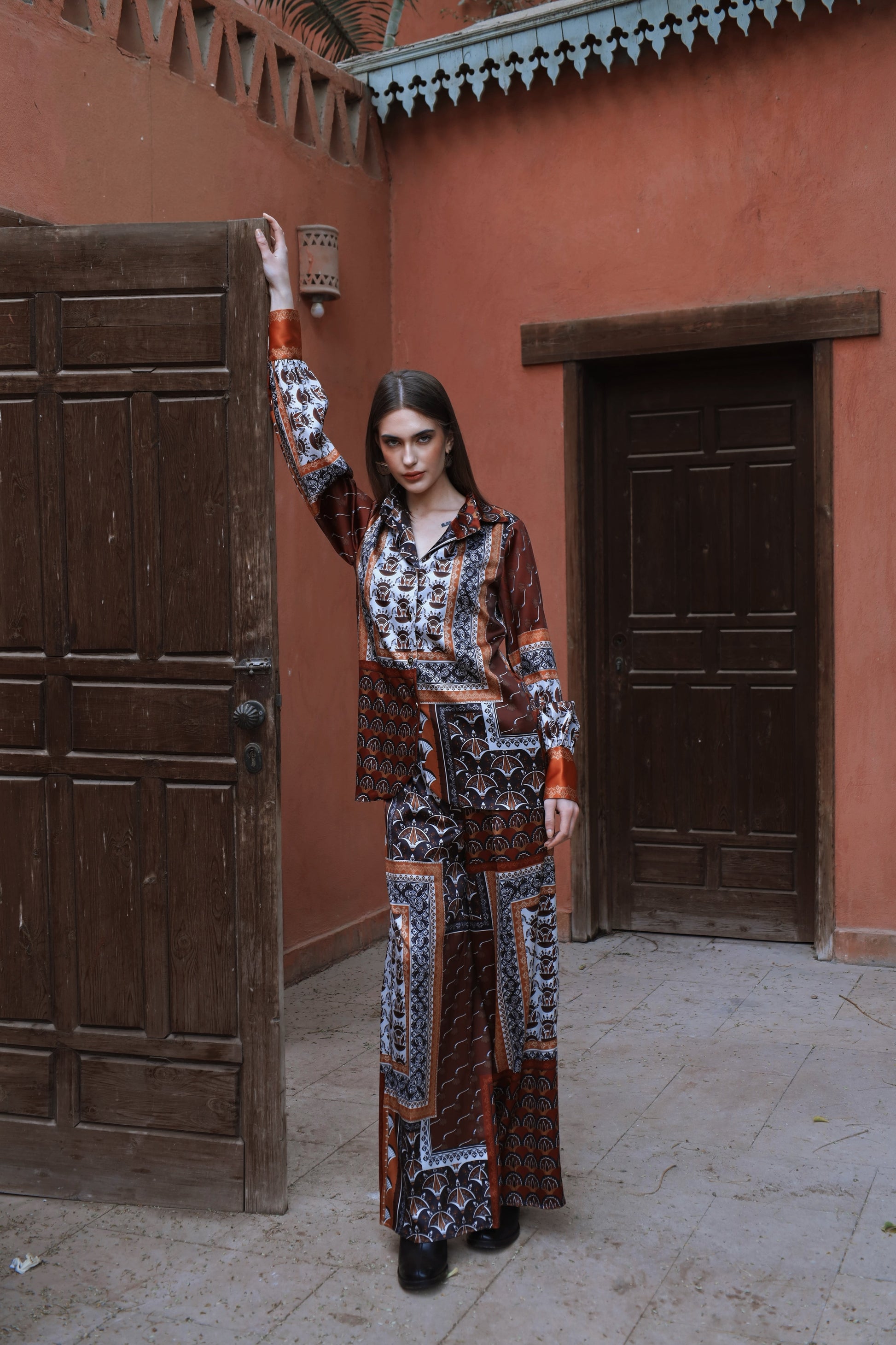 An elegant Victorian-inspired Papyrus Whisper set crafted in luxurious Korean satin. The set features a delicate chemise with a high neckline, buttons, paired with flowing pants that echo timeless grace. Intricate stitching and a soft sheen evoke the beauty of papyrus reeds, blending sophistication and comfort."