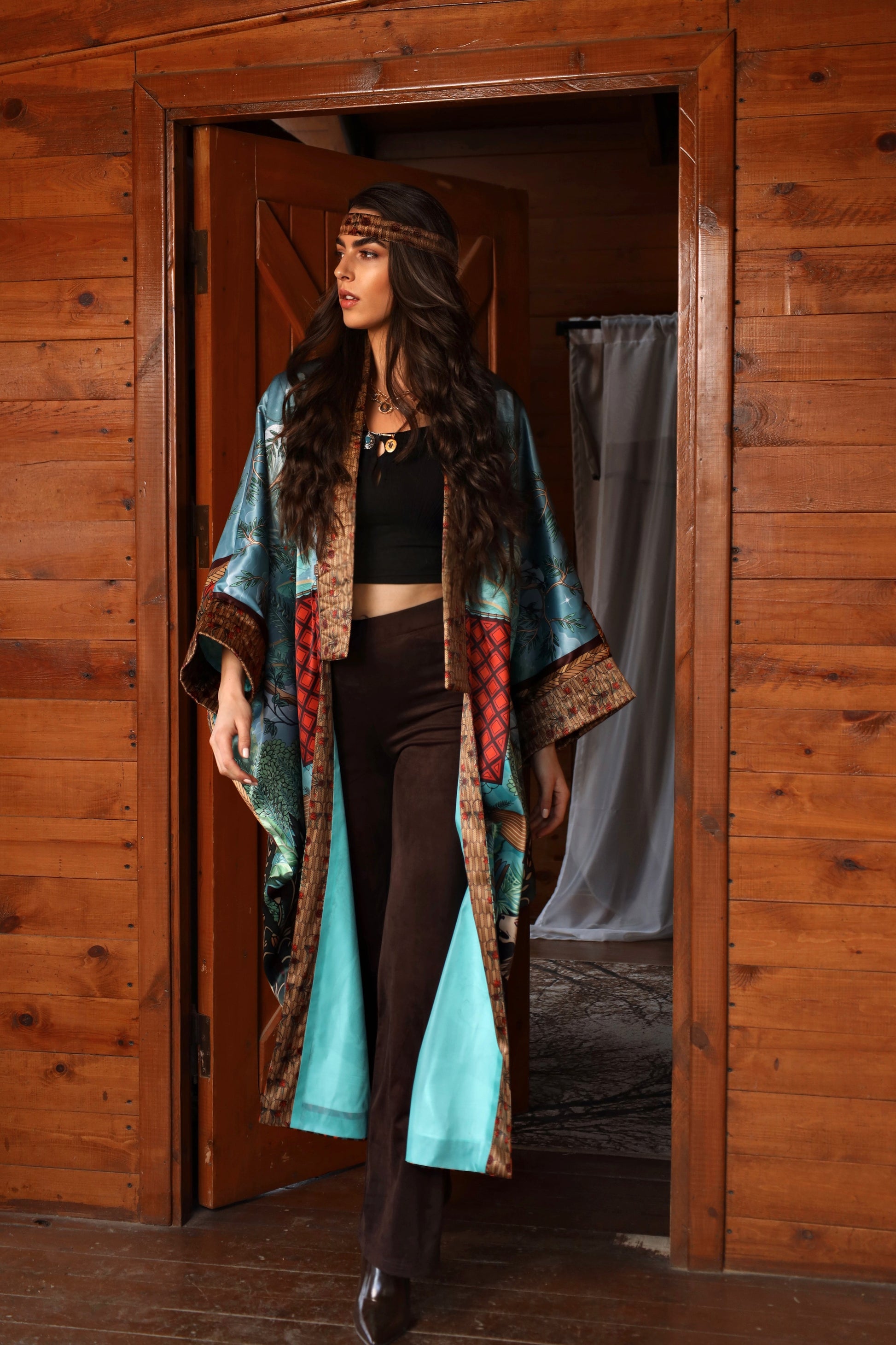 Inspired by Per-Aaru, the Fields of Reeds in Ancient Egyptian belief, this kaftan reflects the eternal garden where the soul journeys beyond time. Lush trees, flowing waters, and sacred animals unfold across the silk, while the boat glides quietly through the landscape—a symbol of passage, protection, and the soul’s voyage between worlds. In Egyptian mythology, the boat was not only a vessel of travel, but a carrier of destiny, moving gently through paradise toward eternal peace. The Per-Aaru Kaftan captures that sacred journey, suspended between earth and eternity.