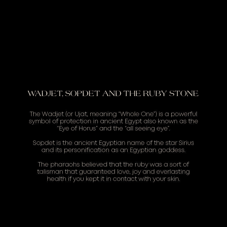 Story: The Wadjet, or the "Eye of Horus," symbolizes protection, while Sopdet, the ancient Egyptian goddess of Sirius, adds celestial charm. The ruby stone, believed to guarantee love, joy, and health, completes this talismanic trio.