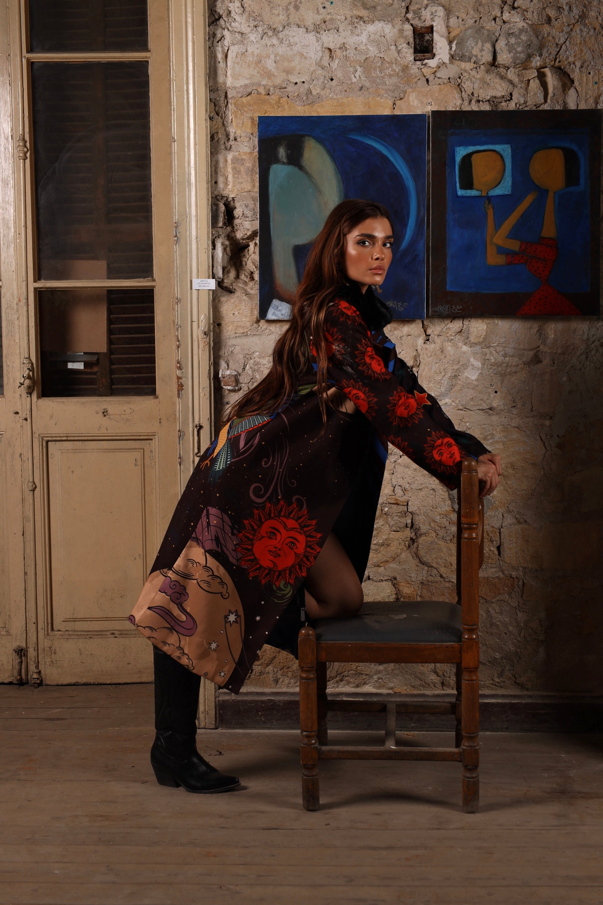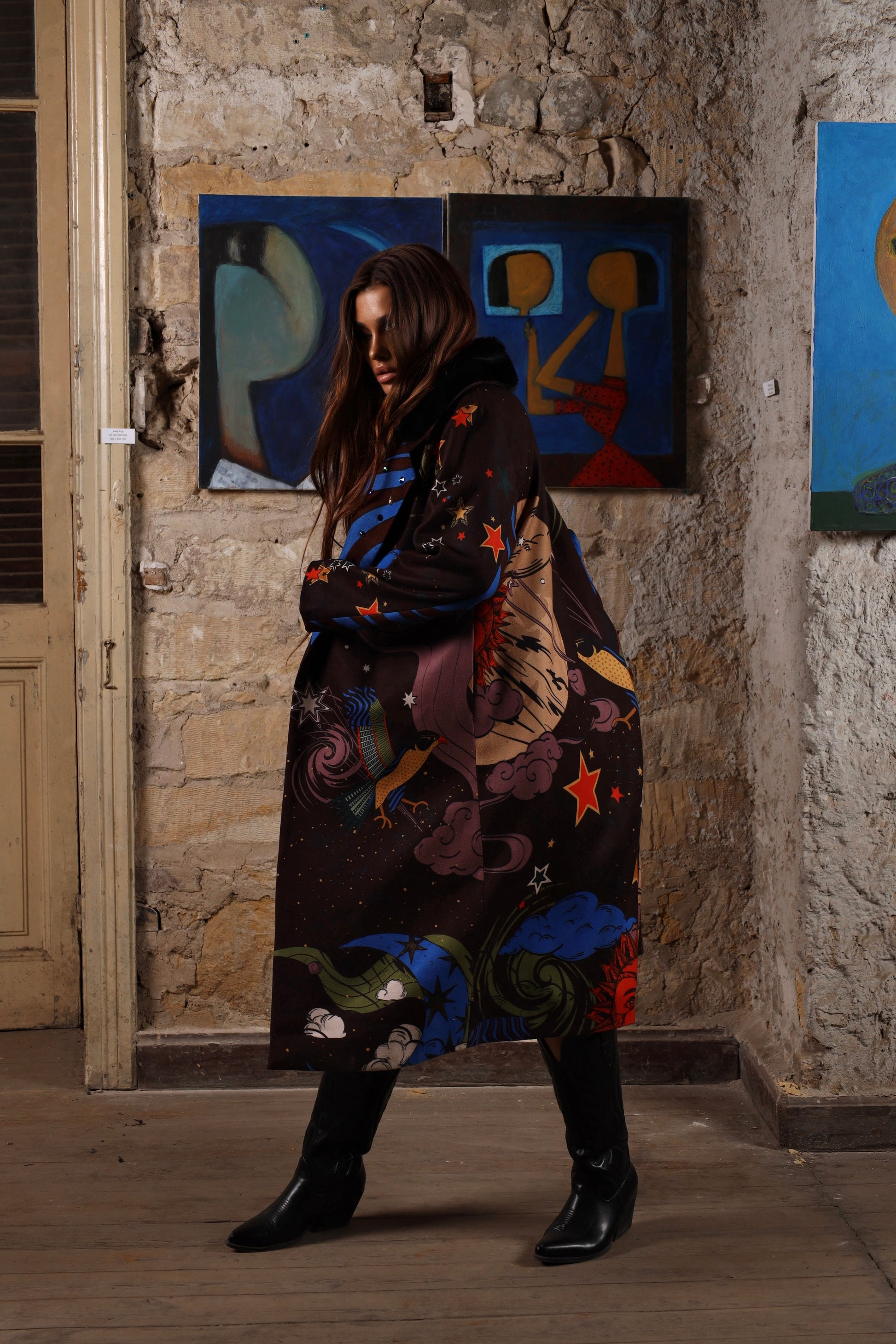 Crafted from luxurious wool-baze, this Air Element coat blends warmth with fluid motion. The artwork evokes drifting breezes, cosmic symbols, and sweeping sky patterns — creating a sense of movement even when the wearer is still. A detachable faux-fur collar (secured with hidden buttons) allows versatile styling, transitioning the coat from dramatic winter elegance to clean, airy structure. The silhouette is tailored yet soft, giving a refined shape that floats with the body — a perfect harmony between warmth and lightness. A modern interpretation of ancient sky symbolism, designed for those who carry freedom, clarity, and vision in their spirit.